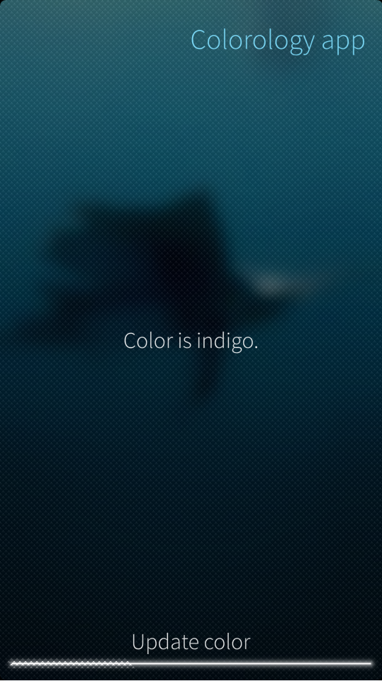 In the middle we display the name of a color. At the bottom is a button. Clicking on it tells the application to contact a web server and download a new color to show. Since this is a sample application we do not actually contact any server, but rather just wait for a while and return a color name chosen at random. This simulates the typical delay you have when using web services.
