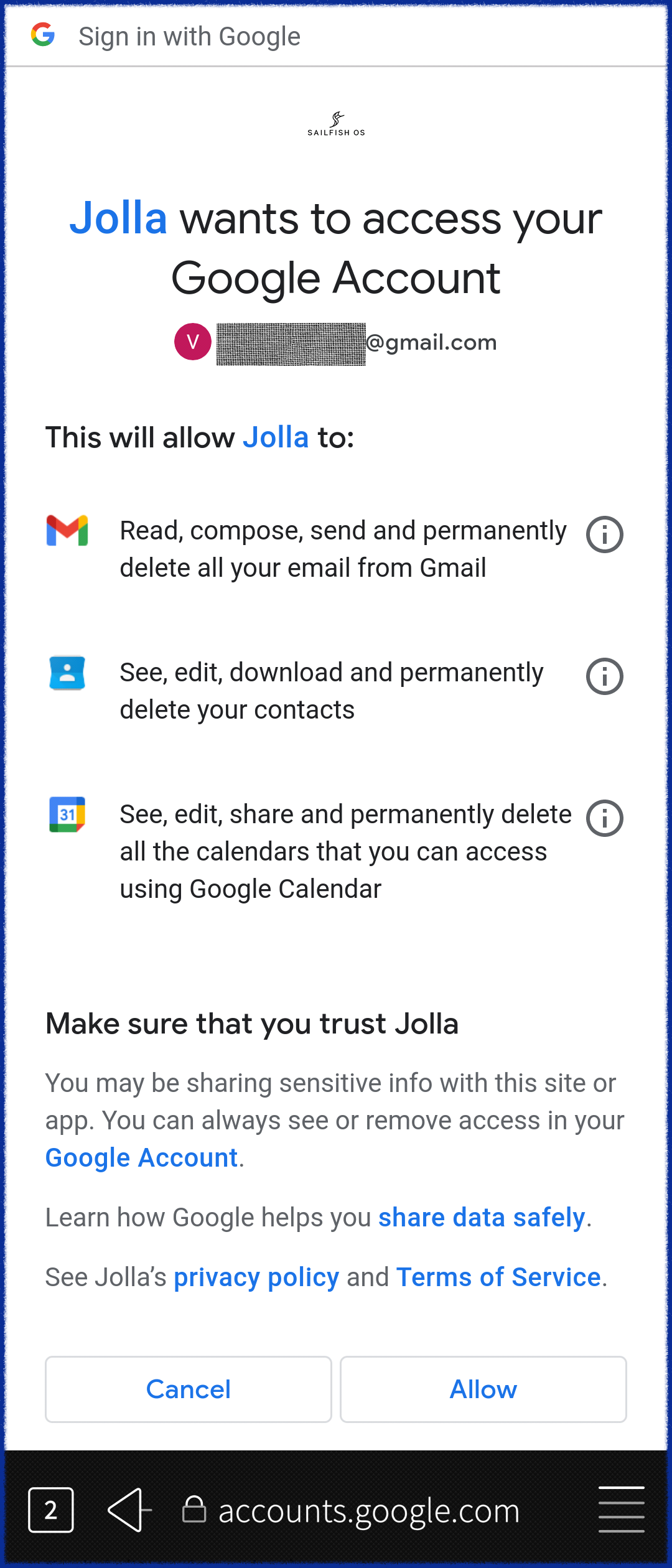 NOTE: The sentences “Jolla wants to access…” and “This will allow Jolla to…” might appear confusing to you. They should actually be stated as “Sailfish OS needs the access to…” and “This will allow Sailfish OS to…” because Jolla Ltd, the company, has nothing to do with your Google account and no access to your phone. The name “Jolla” in this view is derived from the Google service interface (used by this Sailfish app) as Jolla Ltd is the ‘owner’ of the app.
