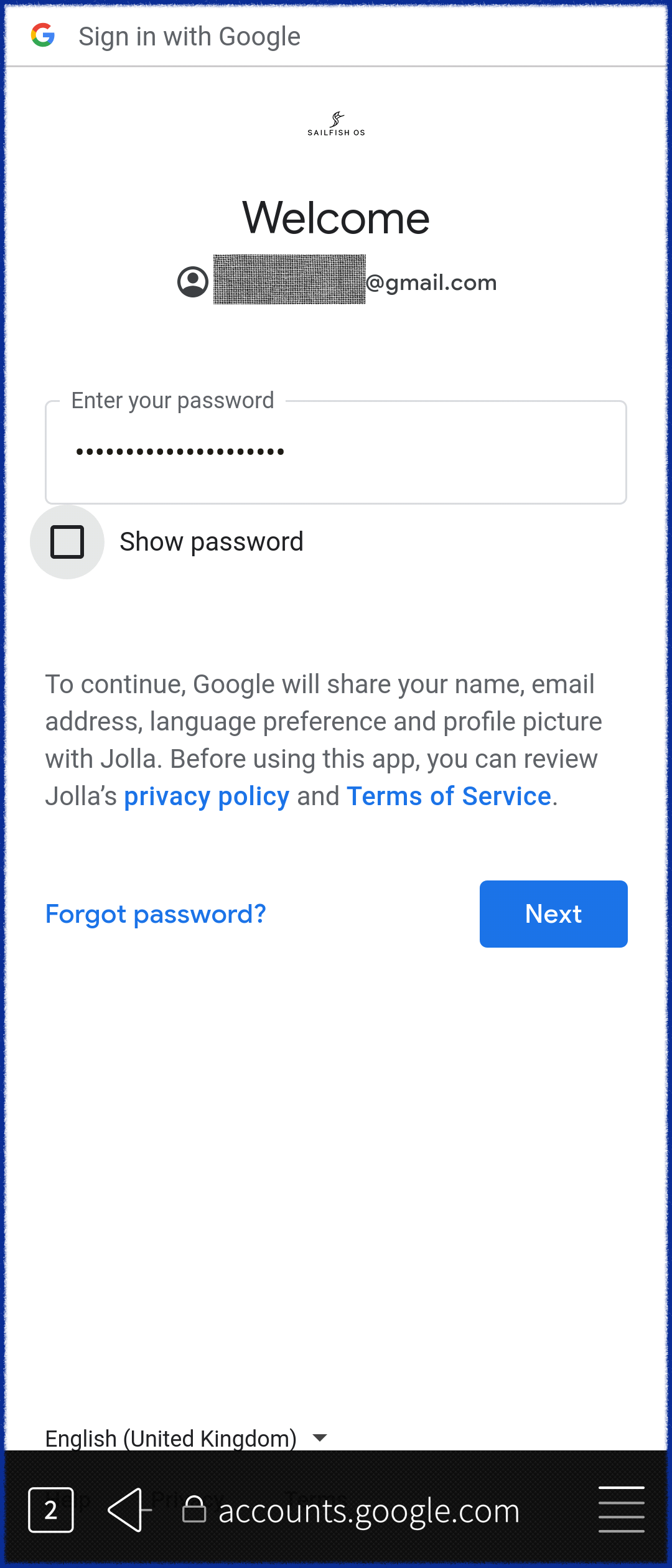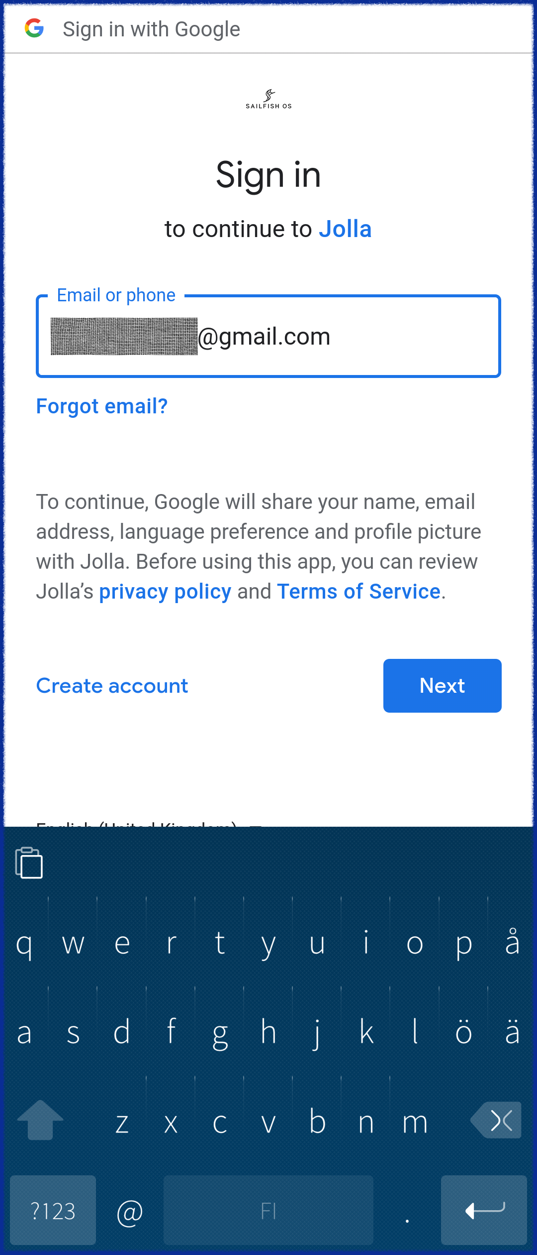 NOTE: The text “to continue to Jolla” might appear confusing to you. It should actually be stated as “to continue to Sailfish OS” because Jolla Ltd, the company, has nothing to do with your Google account and has no access to your phone. The name “Jolla” in this view is derived from the Google service interface (used by this Sailfish app) as Jolla Ltd is the ‘owner’ of the app.
