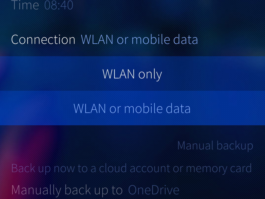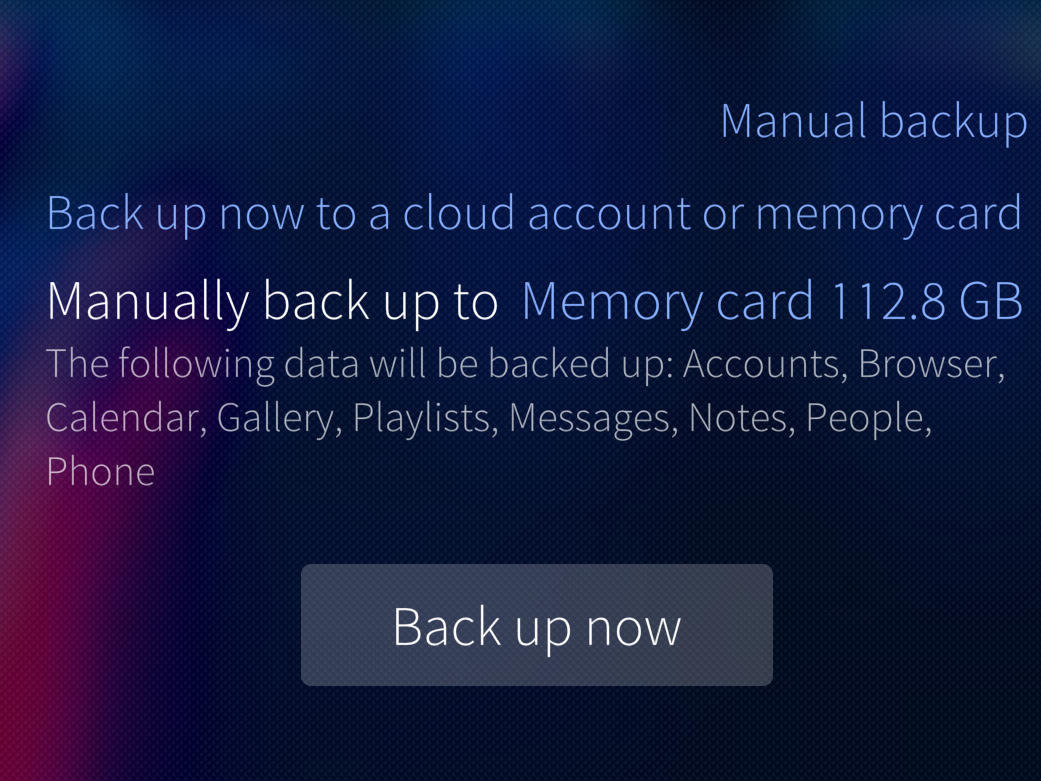 Manual backups (i.e., “backup now”) can be saved to memory cards and to cloud services.