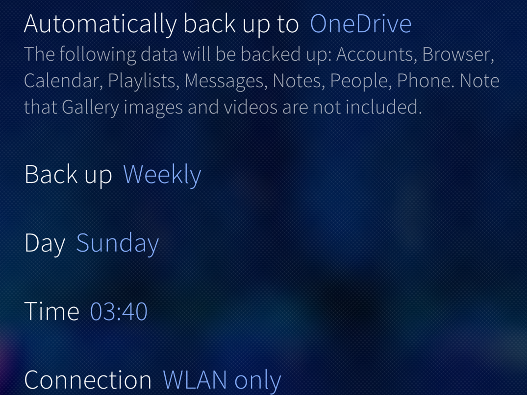 Accounts: your configured accounts (“Settings > Accounts”). You will have to relogin to your accounts after using the Restore function as passwords are not backed up.