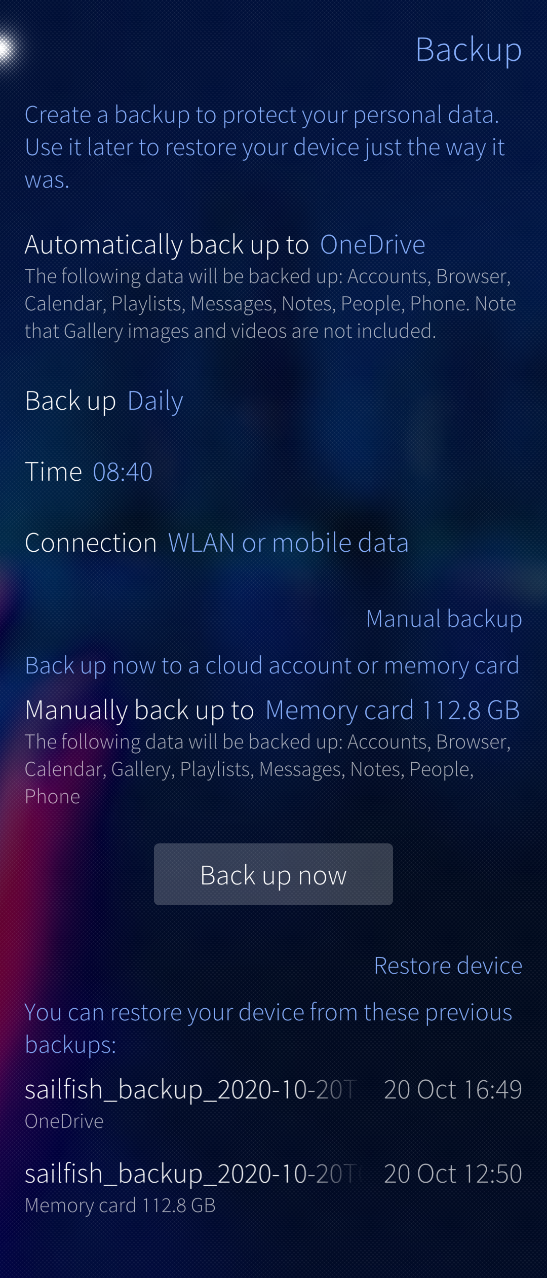 We warmly recommend backing up your data from your Sailfish device to safe storage like a memory card or cloud service (Dropbox, Nextcloud or OneDrive). The latter is probably better as if the device should get stolen then the memory card would be lost, too.