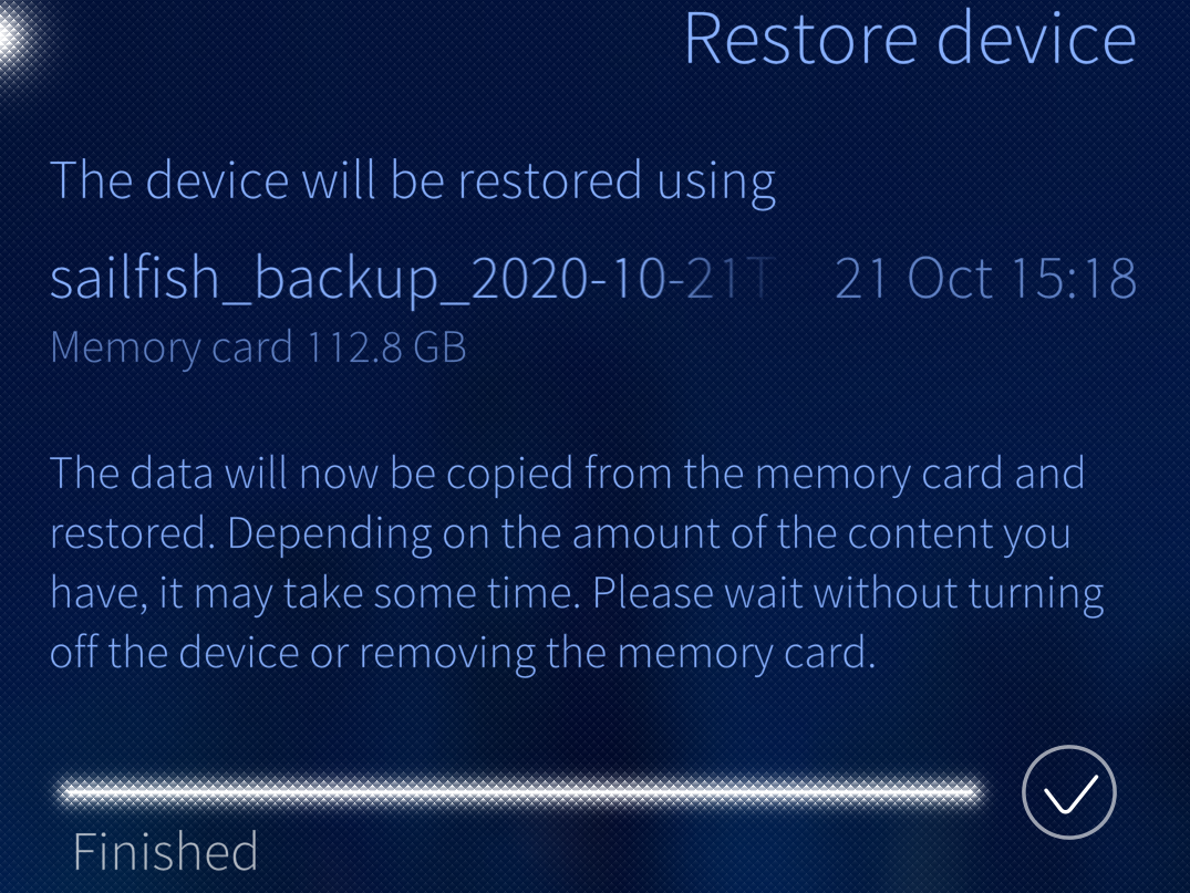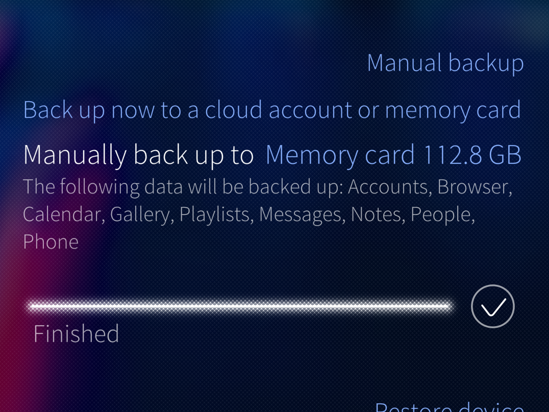 8. When you see the view below the backup process is complete and your backup has been successfully copied to the memory card. Tap the check mark and you are done.