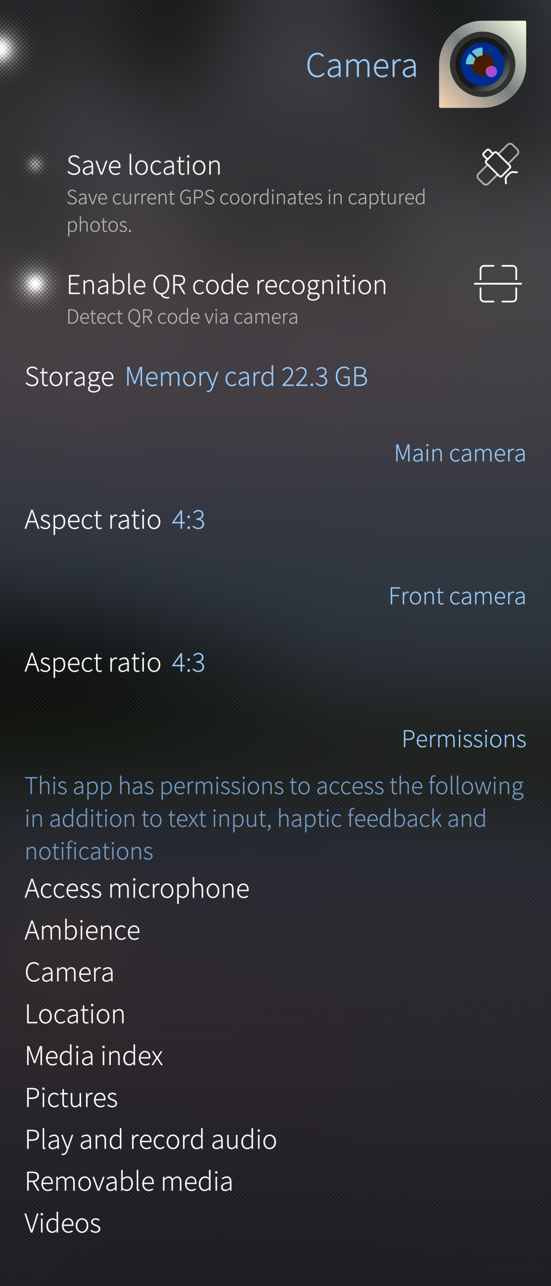 The less frequently needed settings are located in the menu “Settings > Apps > Camera”. In there, you can adjust the settings shown on the screenshot below.