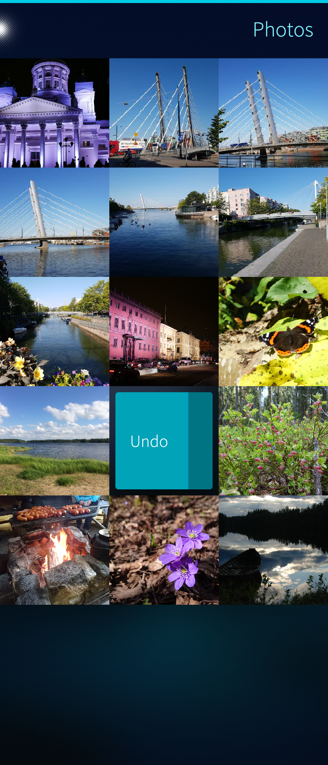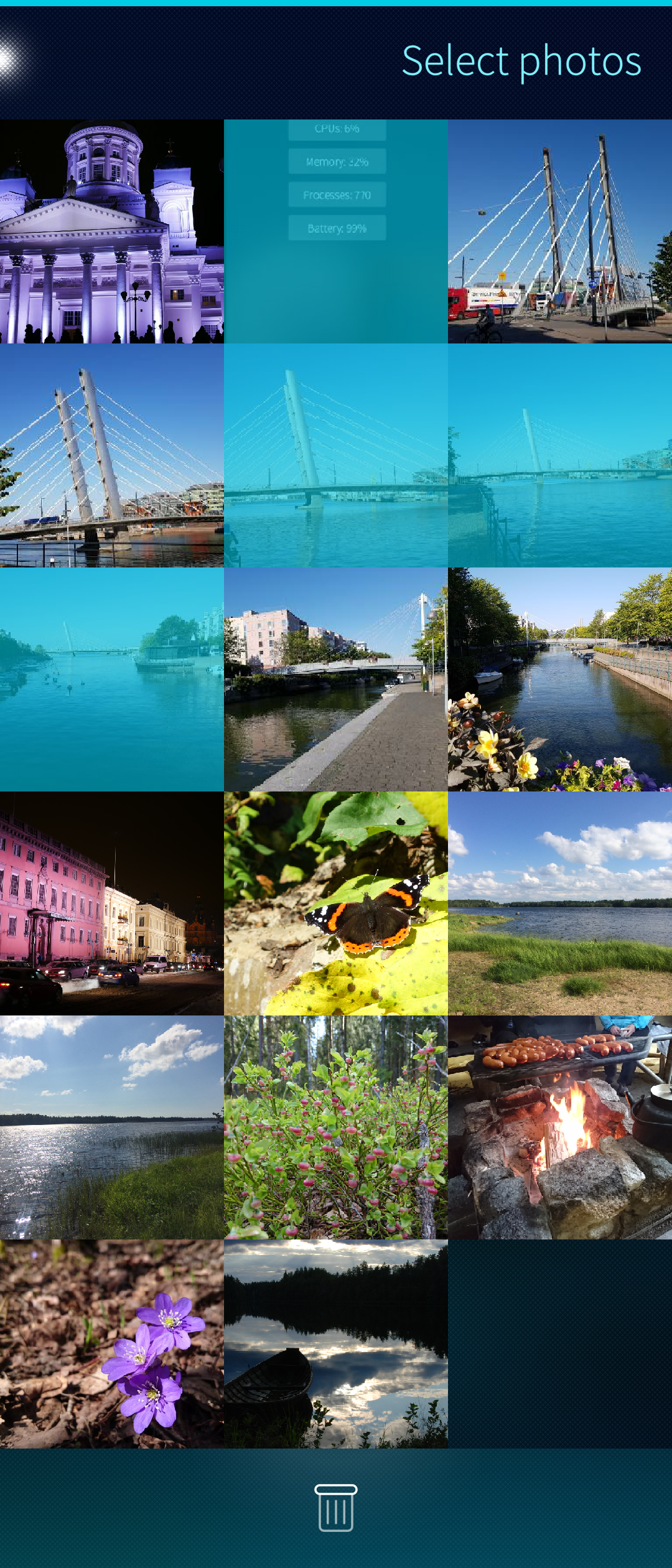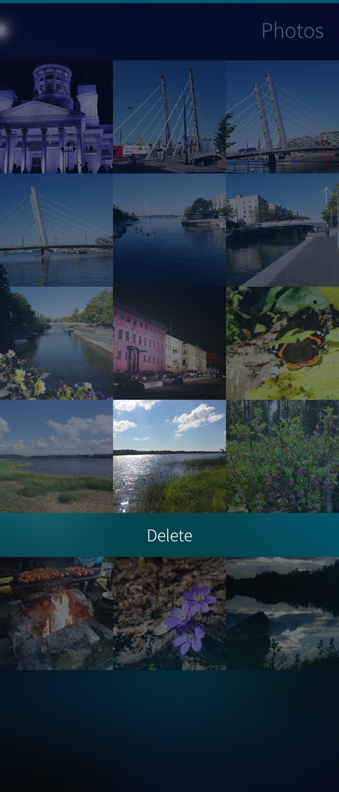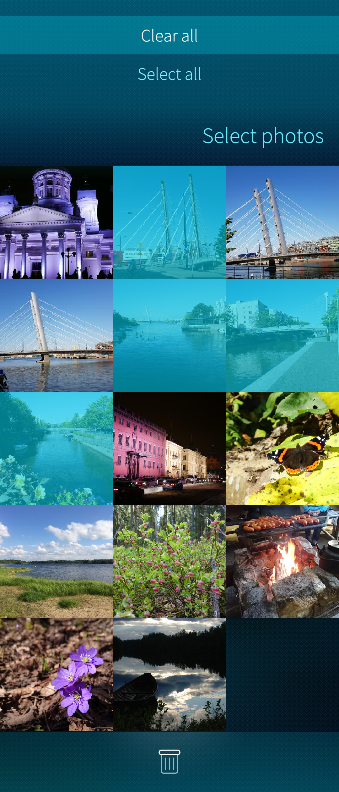 One can select multiple items one by one (by tapping them), or by using “Select all” in the pulley menu during the selection mode. It is possible to cancel the selection by taking “Clear all” (i.e., clear all selections - the photos remain).
