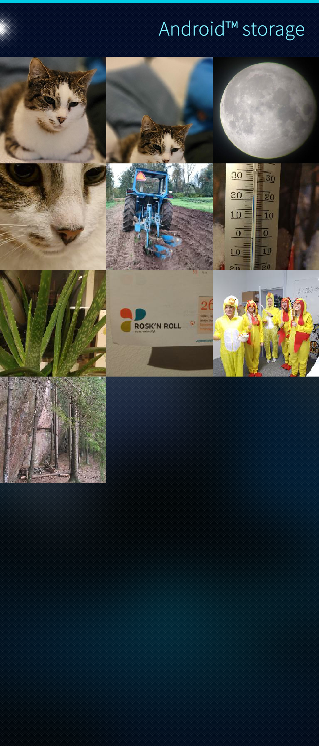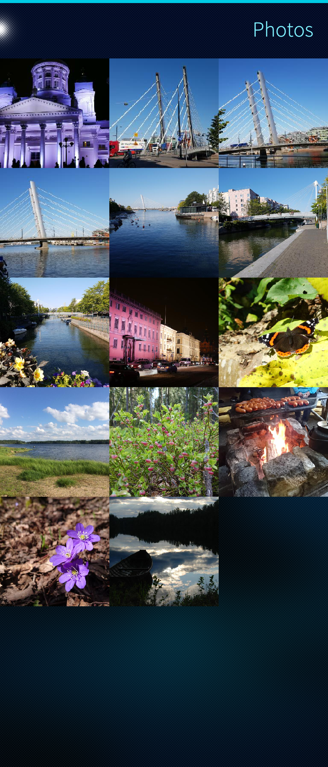 The Sailfish Gallery app contains a collection of photos and videos residing on the phone, in the memory card (if inserted into the device), and even in the cloud and social network services configured to your Sailfish device. Sailfish OS runs a background service 1 that looks for new photos and videos, keeping the collection up to date.