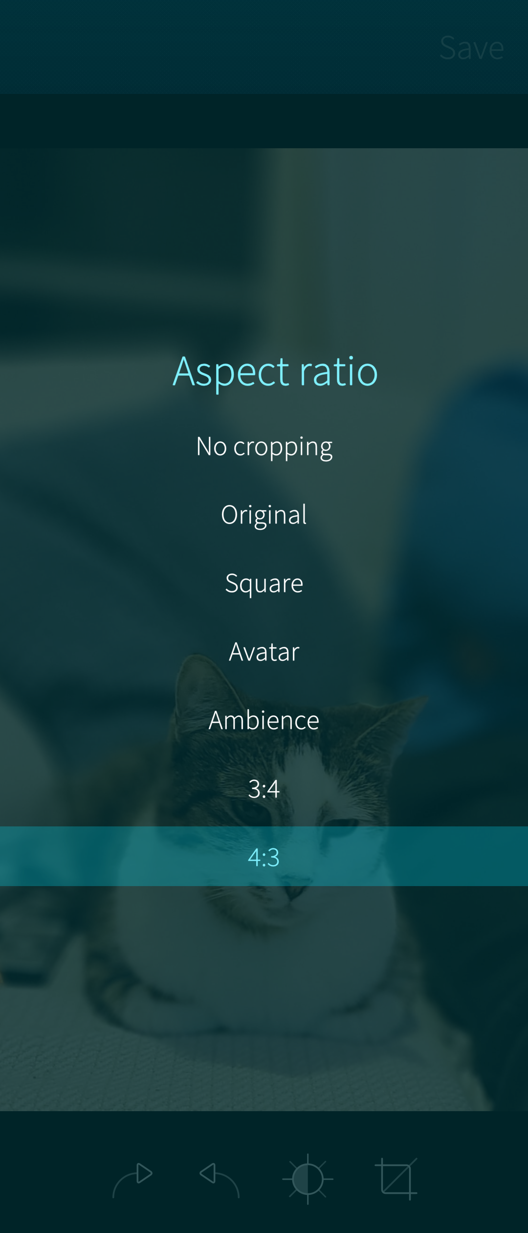 In the example below, we use the crop tool. The first step is to select the aspect ratio. Then, move the object to the desired position. Use the “Save” button at the top right corner.