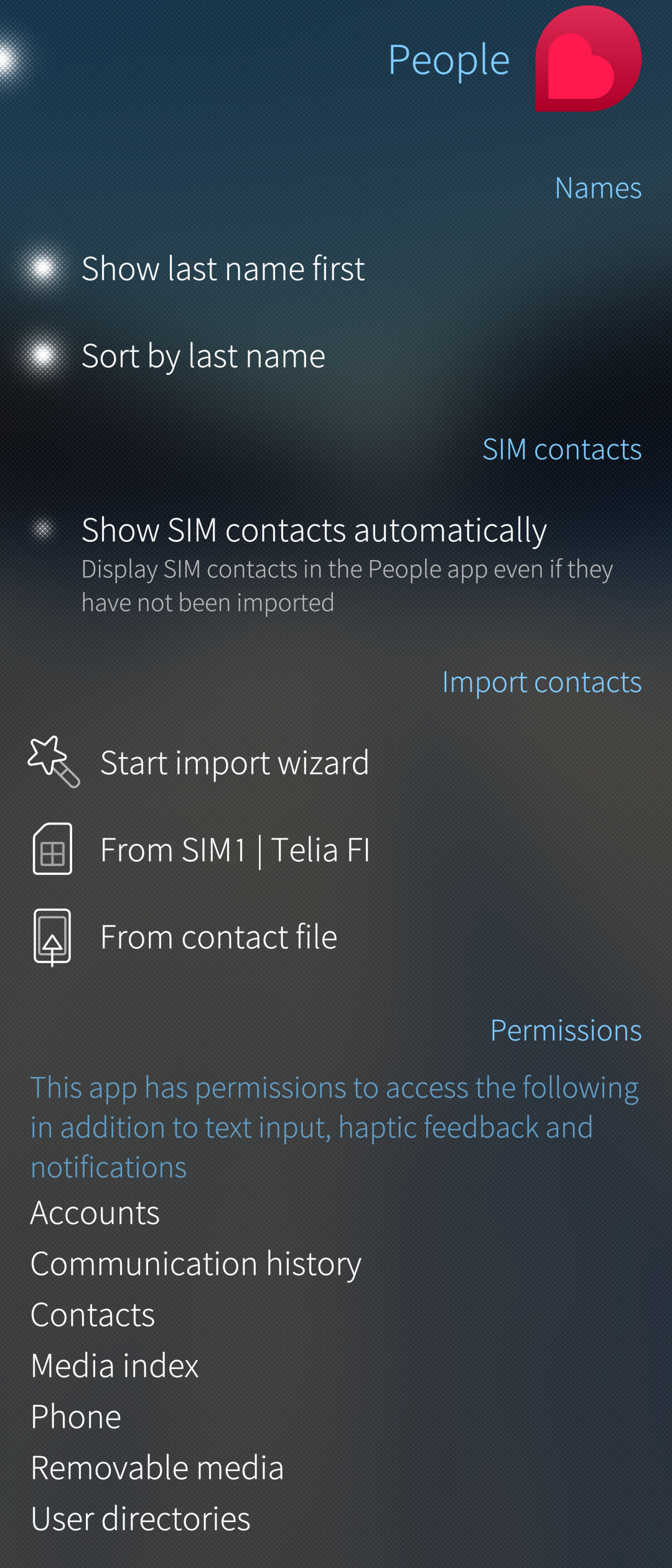 On Sailfish phones, you can see the options for importing contacts on the menu page “Settings > Apps > People” in the section “Import contacts” (see Pic 1 below). The import utility is based on using standardized vCard files (also known as “VCF files” or *.vcf). The standard structure of those files makes it possible to process the contact data in the correct way and save them to the Sailfish contacts database.