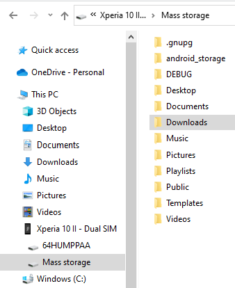 8) Click Mass storage on the left under the phone. Observe that it contains the Downloads folder (and many more) which appear on the right (Pic 5). Click _Downloads.