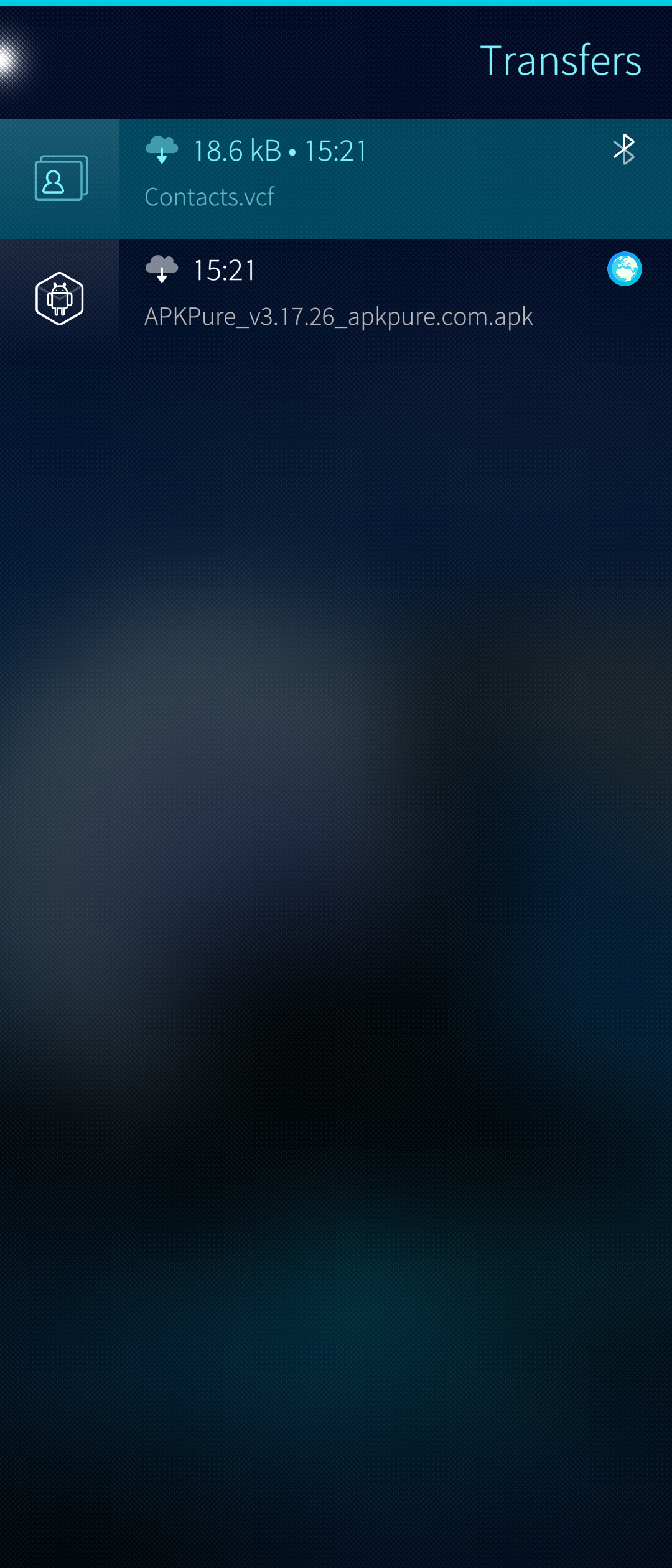 5) On your Sailfish phone (the target phone), go to “Settings > System > Transfers”. File Contacts.vcf appears at the top of the list (Pic 9). The actual location of the file is in the Documents folder but that is not relevant here.