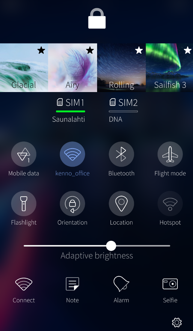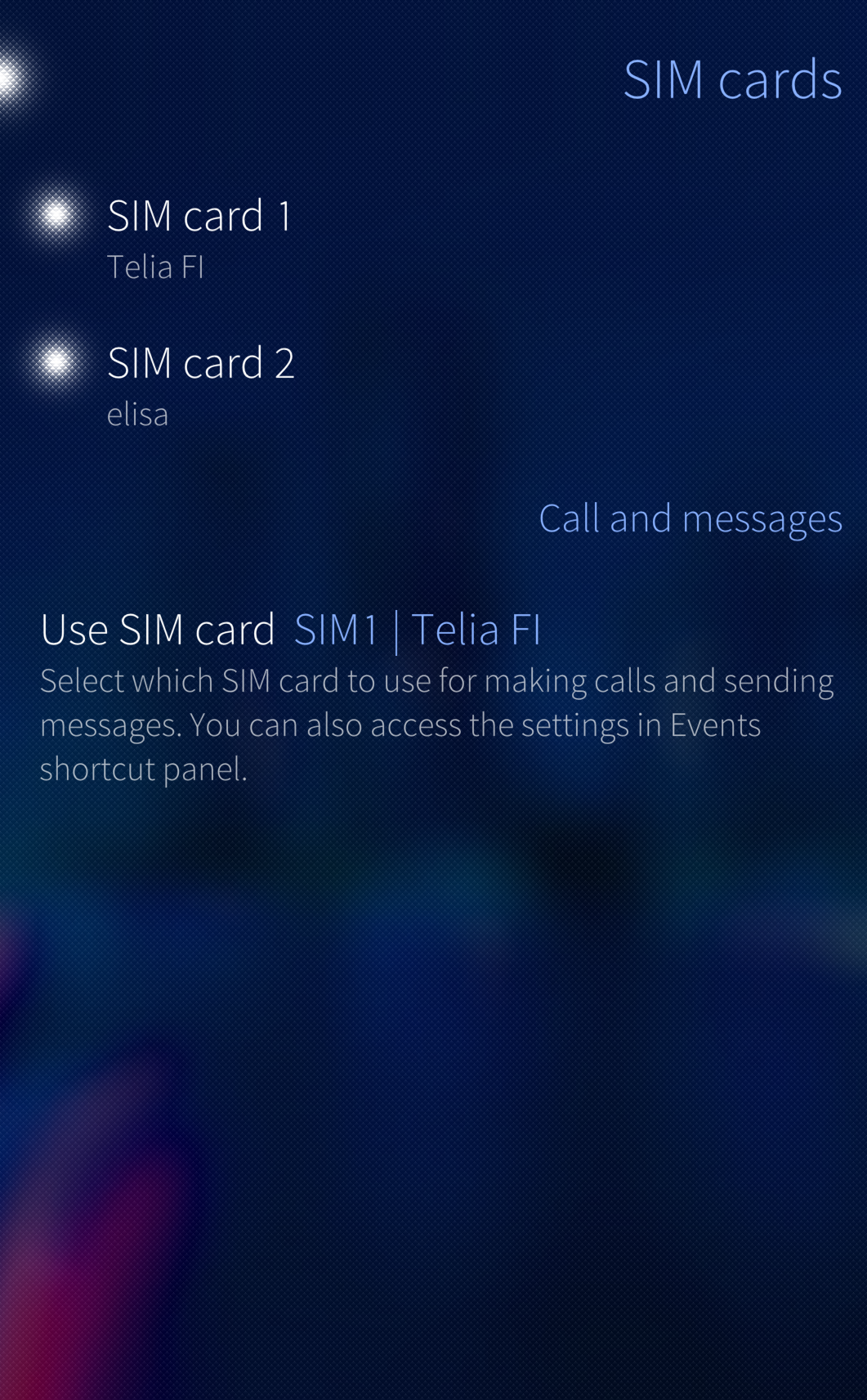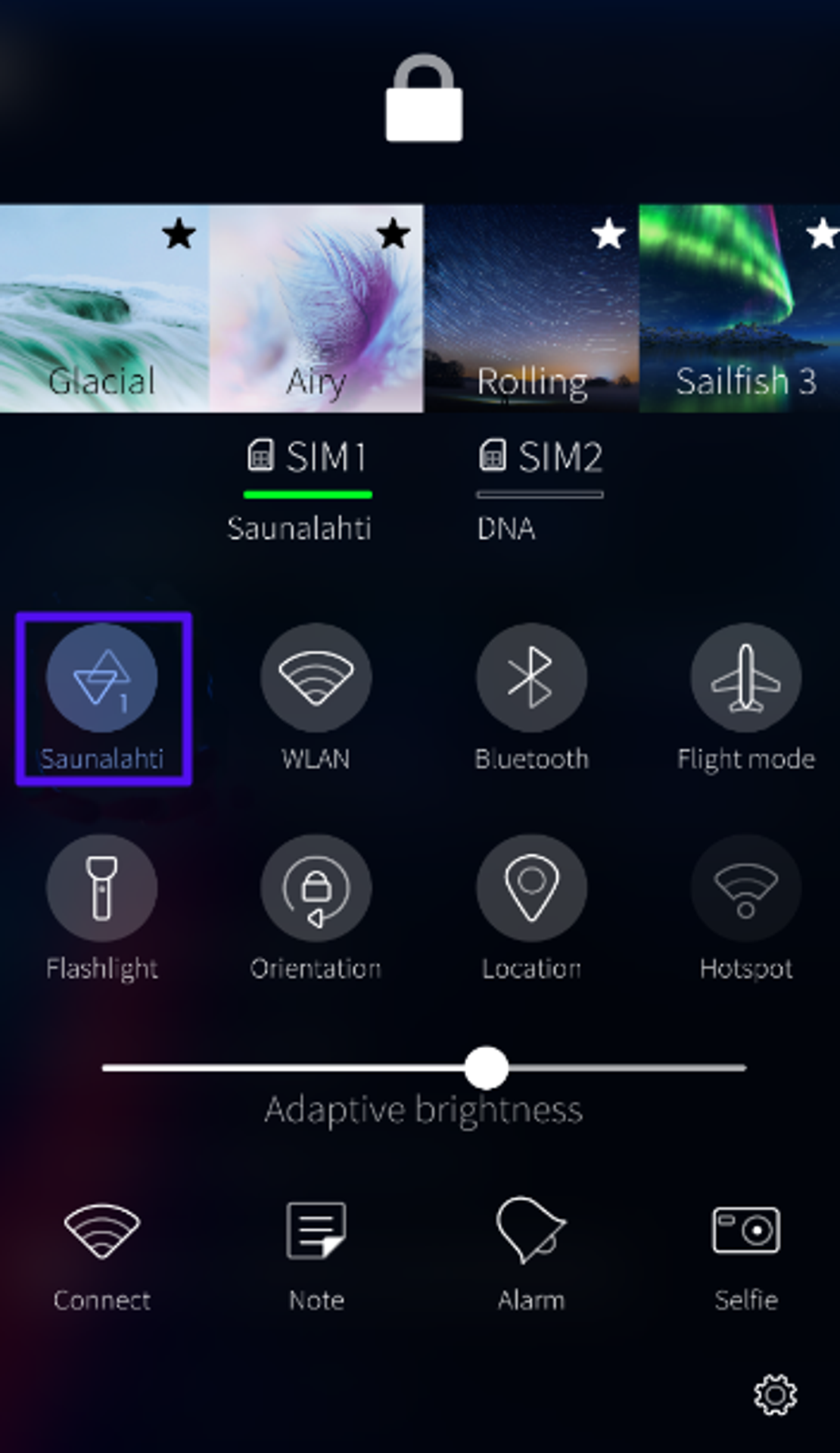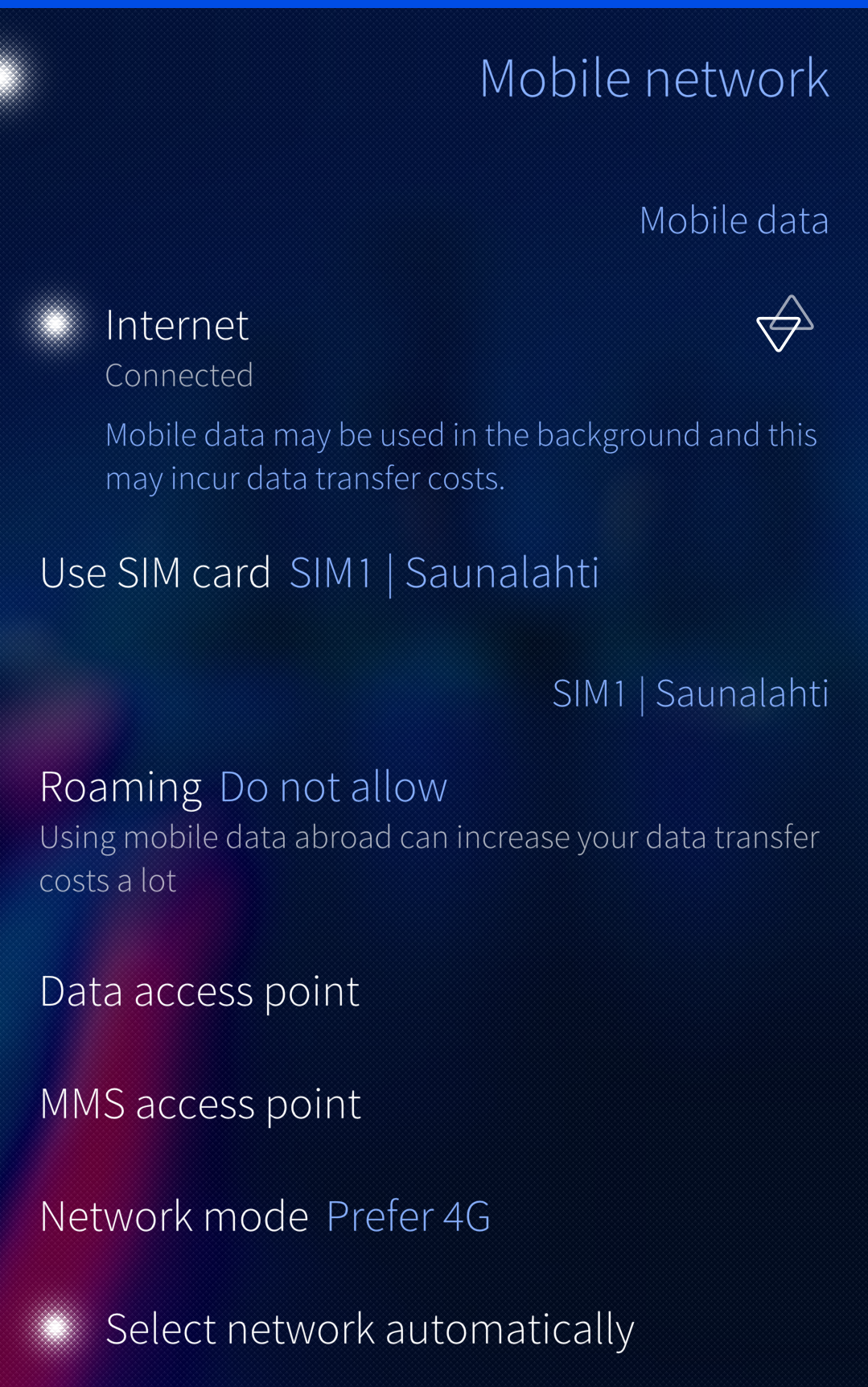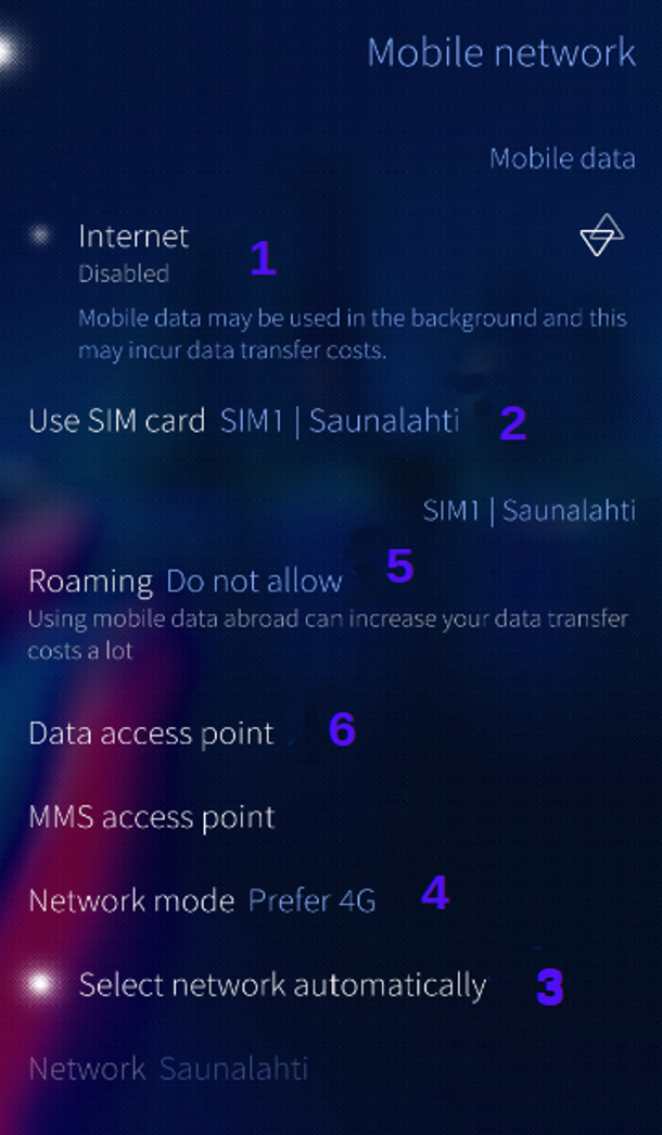 NOTE: _The item “SIM1 Saunalahti” with a green line indicates the SIM card selected for phone calls and SMS. It does not affect the mobile data service, i.e., even if the green line was at “SIM2 DNA” you could still use mobile data via “Saunalahti” as shown in the 1st and 2nd picture from the left.