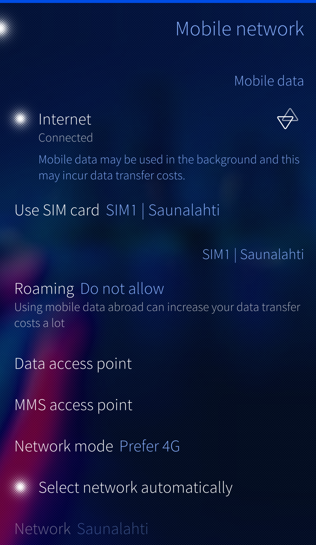 The 2nd picture below shows an active Internet connection arranged with mobile data. It is based on the service from operator “Saunalahti” (SIM1).