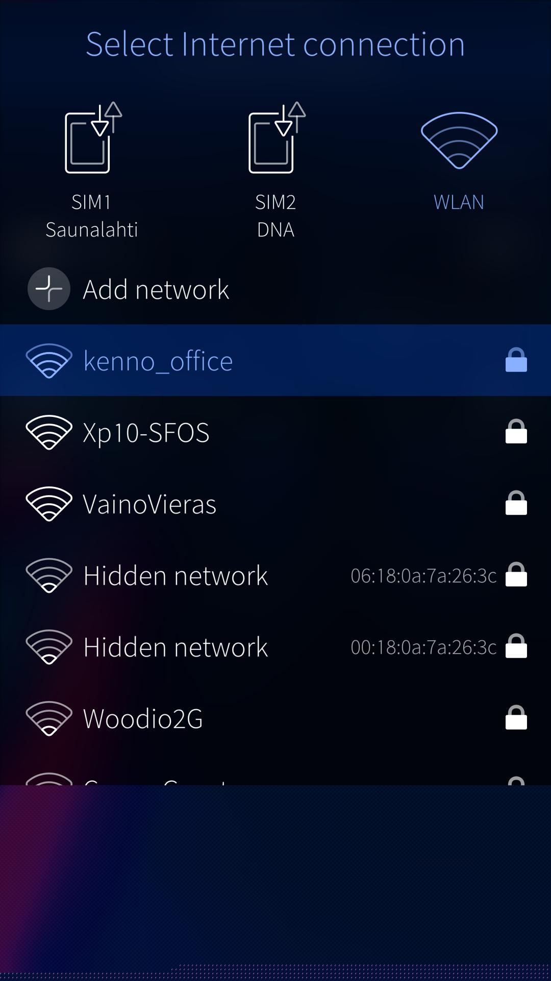 Sailfish devices can handle one Internet connection at a time. The connection can be established via a WLAN (WiFi) network or via a mobile network. For the latter, there may be one or two options, depending on the number of SIM cards inserted and enabled.