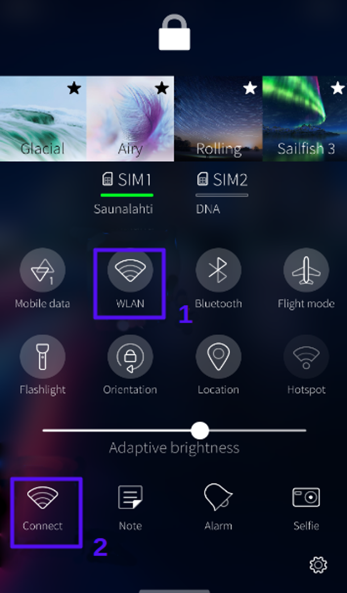 Look at the WLAN icon (item #1) in Pic 13 (below). It does not have any colour and there is no network name (SSID) under it (just “WLAN”). This implies that the WLAN service is off. By tapping this icon, Sailfish OS will connect to your saved WLAN network having the strongest signal currently.