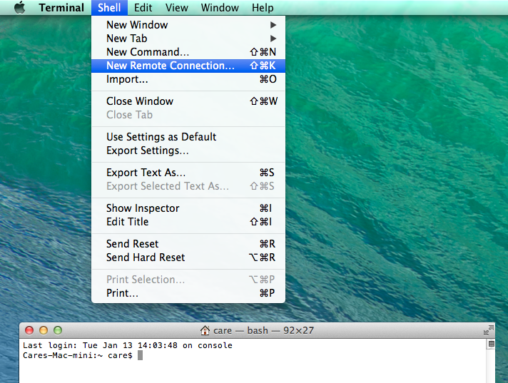 6) Once Terminal is open, select Shell “New Remote Connection…”