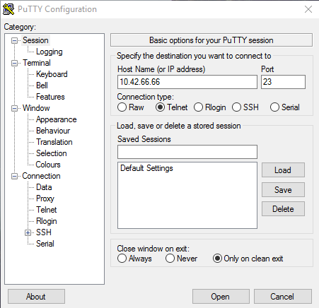 - On the first screen of Putty, select Telnet as the Connection type (default is SSH) and then enter and set Host Name (IP address) to 10.42.66.66. See the picture below. Click Open.