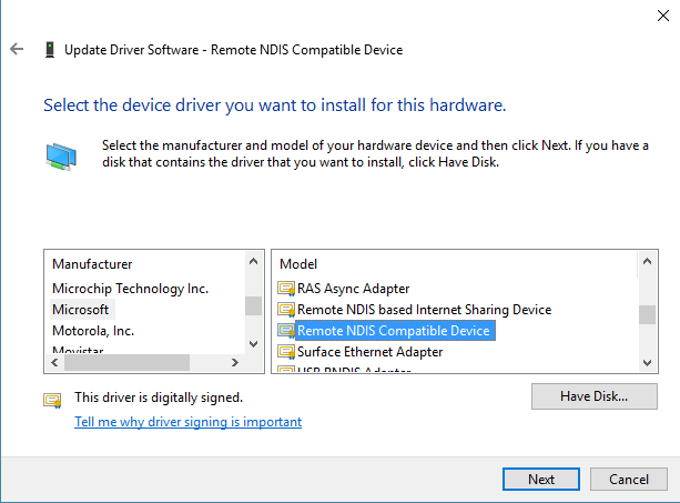 9) Select “Next”. Windows will present a warning dialogue telling that it is not safe, etc. Ignore this. Proceed to install it. Windows should show a message about a successful update. Close it. “RNDIS” should appear now below Network adapters.