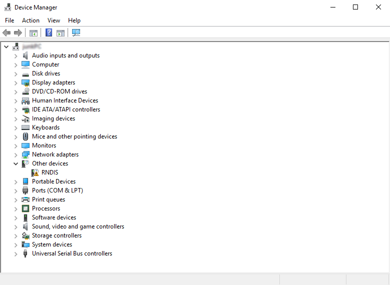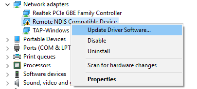 4) Right-click on the RNDIS item (see above) and select Update Driver Software.