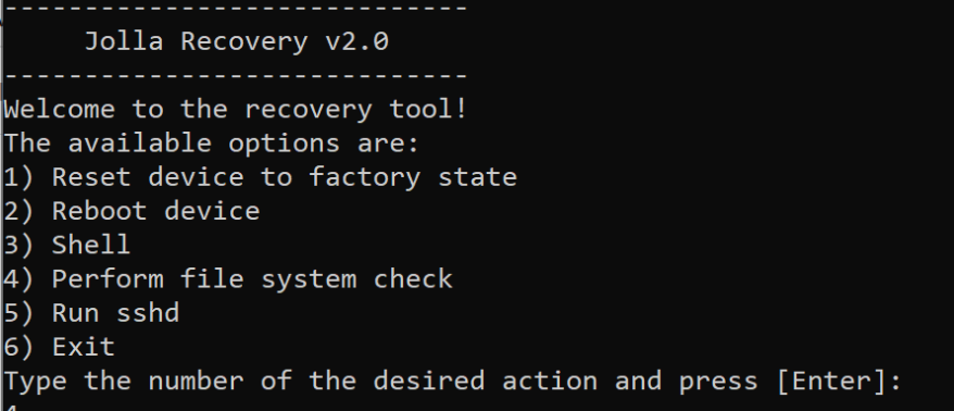 It may be possible to save some data from your device using option “3) Shell” in the Recovery menu. For this operation, you will need a MicroSD card inserted into your phone. The card must have been formatted for Sailfish OS (see the help article on SD cards).