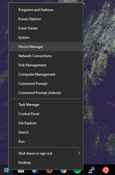 - Windows 10: Open Start Menu and type “device manager”. You should see Device Manager in the search list now. Alternatively, right-click on the Windows Start menu and find Device Manager in the list (see picture below).