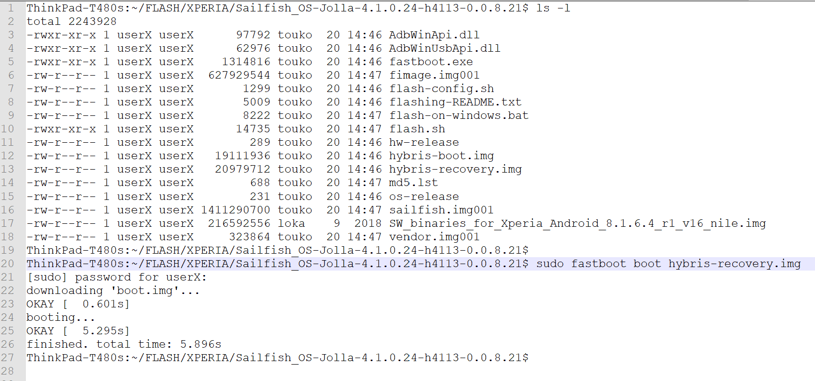 as belongs to the Sailfish OS version of your phone currently. In other words, if you have updated OS version 4.3.0 (say) to your phone, then you should use the hybris-recovery.img of OS version 4.3.0. To ensure this, download the latest Sailfish OS image from Jolla Shop (provided that you have updated your phone to the latest). Unzip the archive and observe the hybris-recovery.img file in it. - Open the Terminal app on your computer. Proceed to the directory where you have the hybris-recovery.img file.