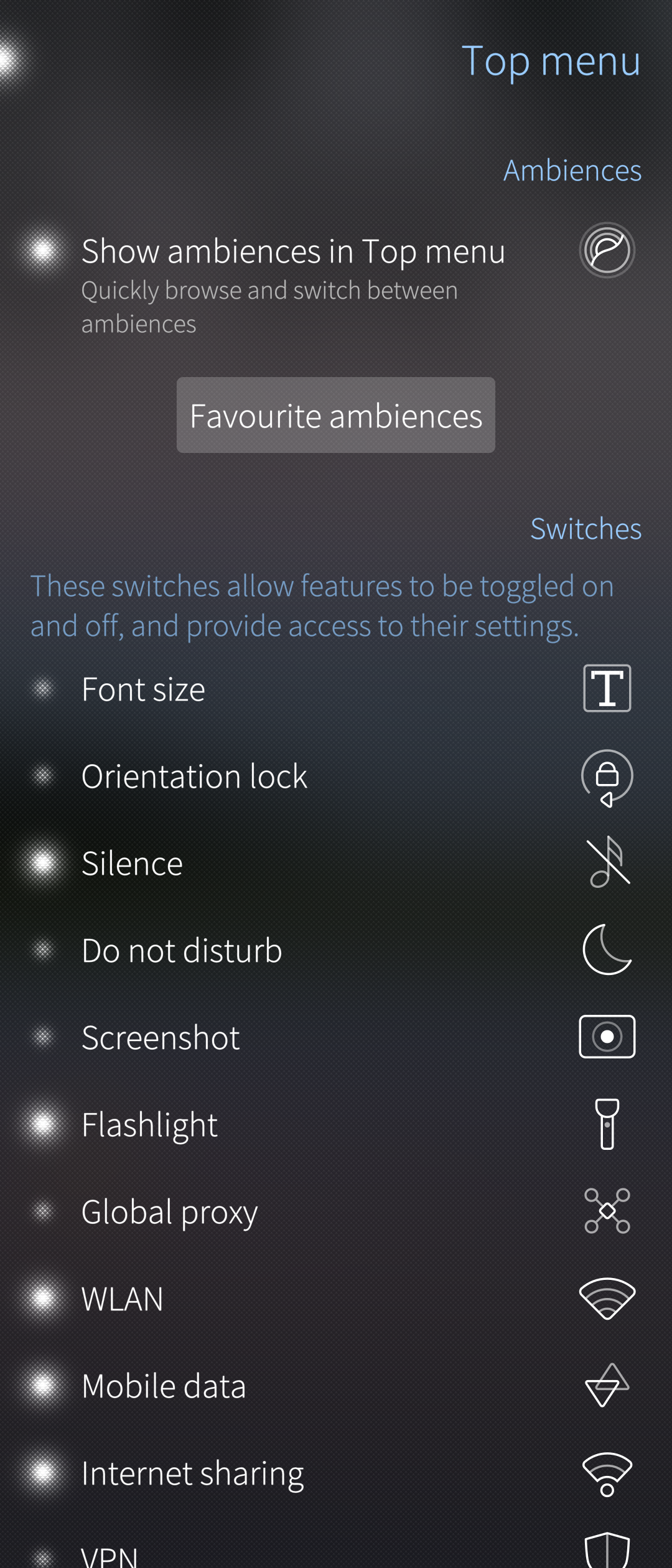 You can setup the Top menu actions and settigs by opening the top menu with the top swipe and tapping the settings icon on the right bottom corner and then open ‘Go to Top menu settings’. From the Top menu you can enable or disable various sounds and feedback related settings to the top menu.