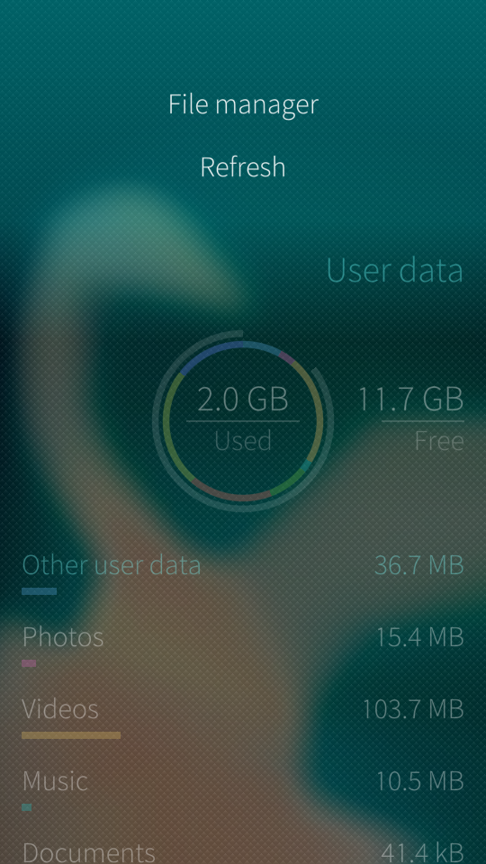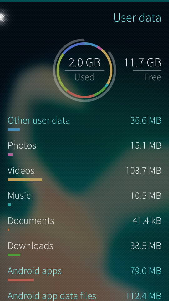 If you suspect that the figures in “User data” are not accurate, please try the “Update” function in the pulley menu. By tapping an item shown in white text, the respective app will open up. This makes it easy to take a closer view to the big files.