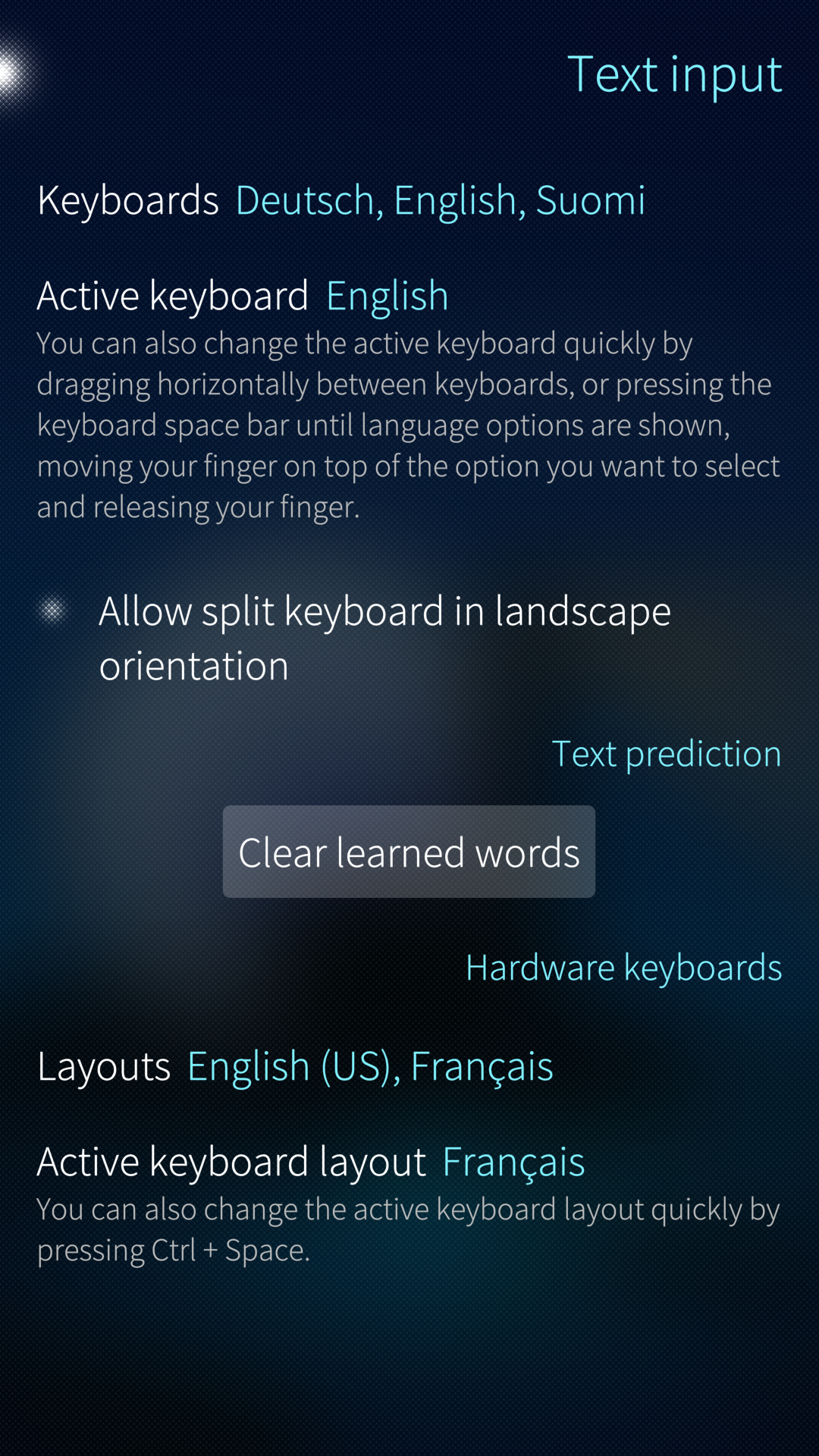 Text prediction collects the words that you type into a dictionary of your own. Those words appear among the suggested words when you type. With the button “Clear learned words” you can erase the words that have been saved into the dictionary.