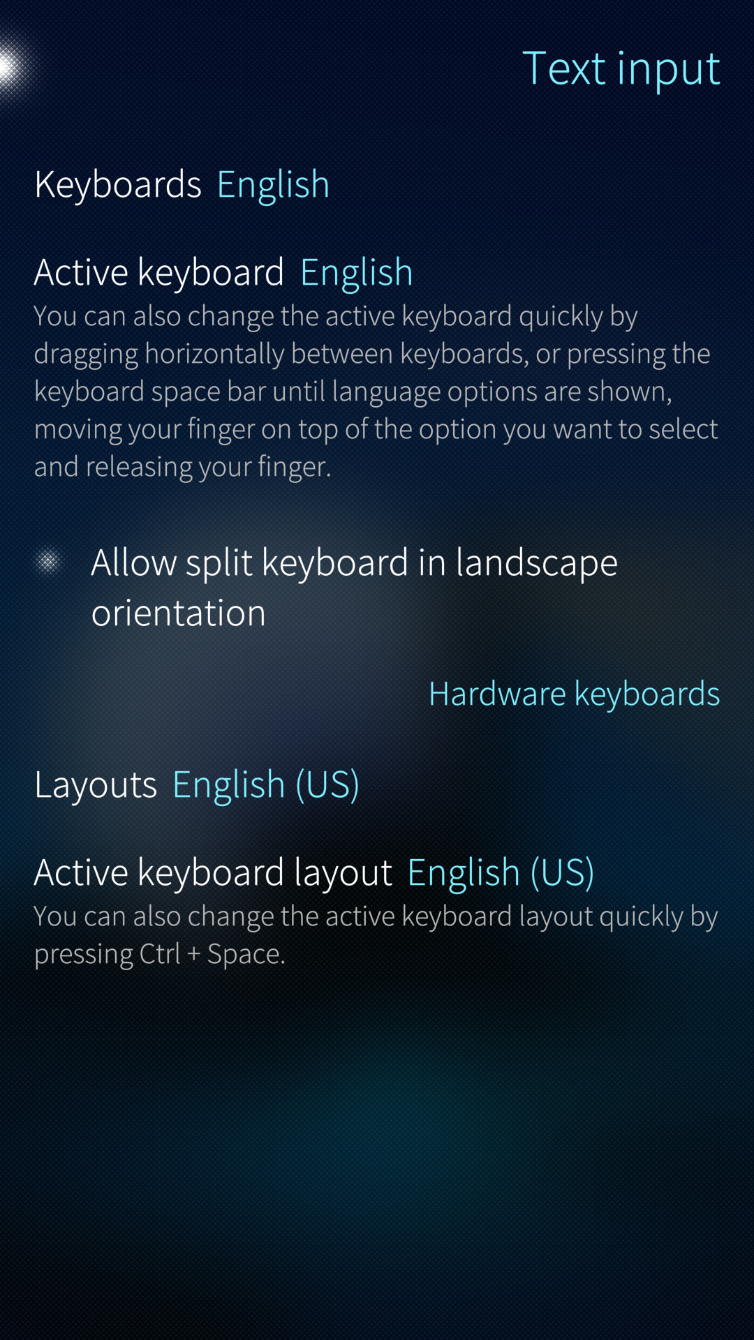 In the lower part of the first picture, there is a section for “Hardware keyboards”. This is for Bluetooth keyboards connected to Sailfish devices. This section has the items “Layouts” and “Active keyboard layout”. These items correspond to those of the virtual keypad, i.e., “Keyboards” and “Active keyboard”. It is possible to define one or more keyboard layouts and select which of them is active currently on the Bluetooth keyboard.