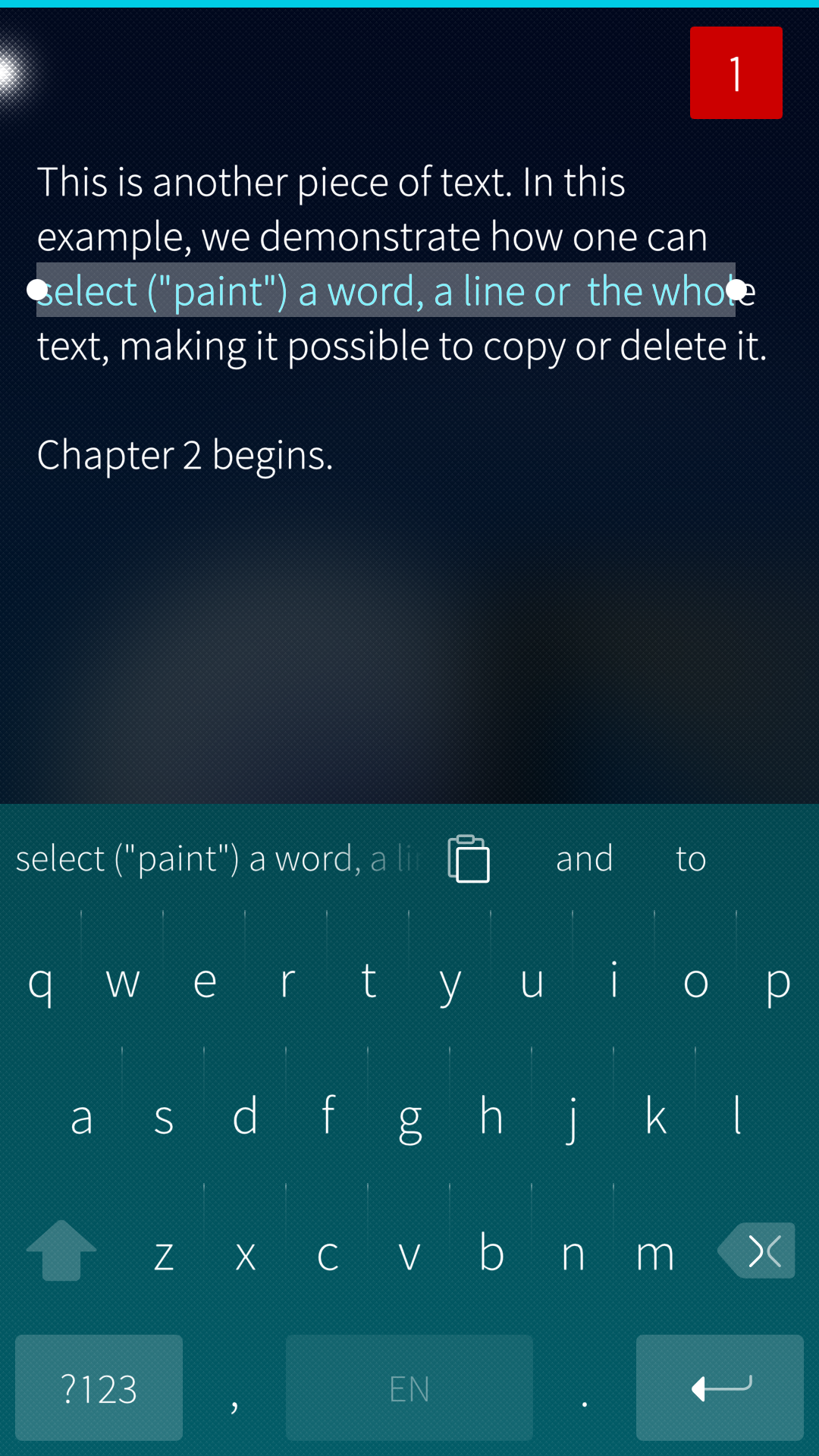 - Tap on the text you have written. Put your fingertip to the same point again and swipe along the display, preferably diagonally. Start swiping immediately after putting the fingertip, or else the nearby word would become painted (see the next chapter)