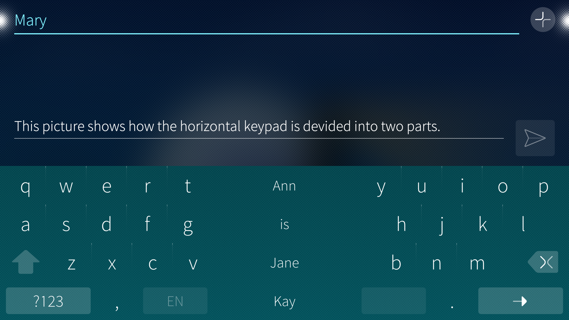 Enabling Allow split keyboard in landscape orientation makes the horizontal keyboard appear divided into two parts, one for the left and the other for the right hand. The word suggestions appear in the middle. This is obviously for large screen devices like the Tablet to allow for faster typing.