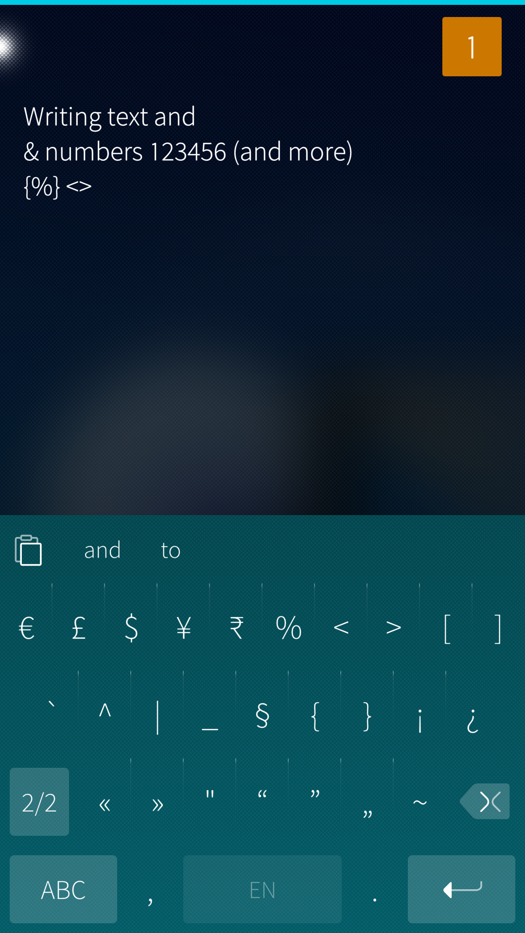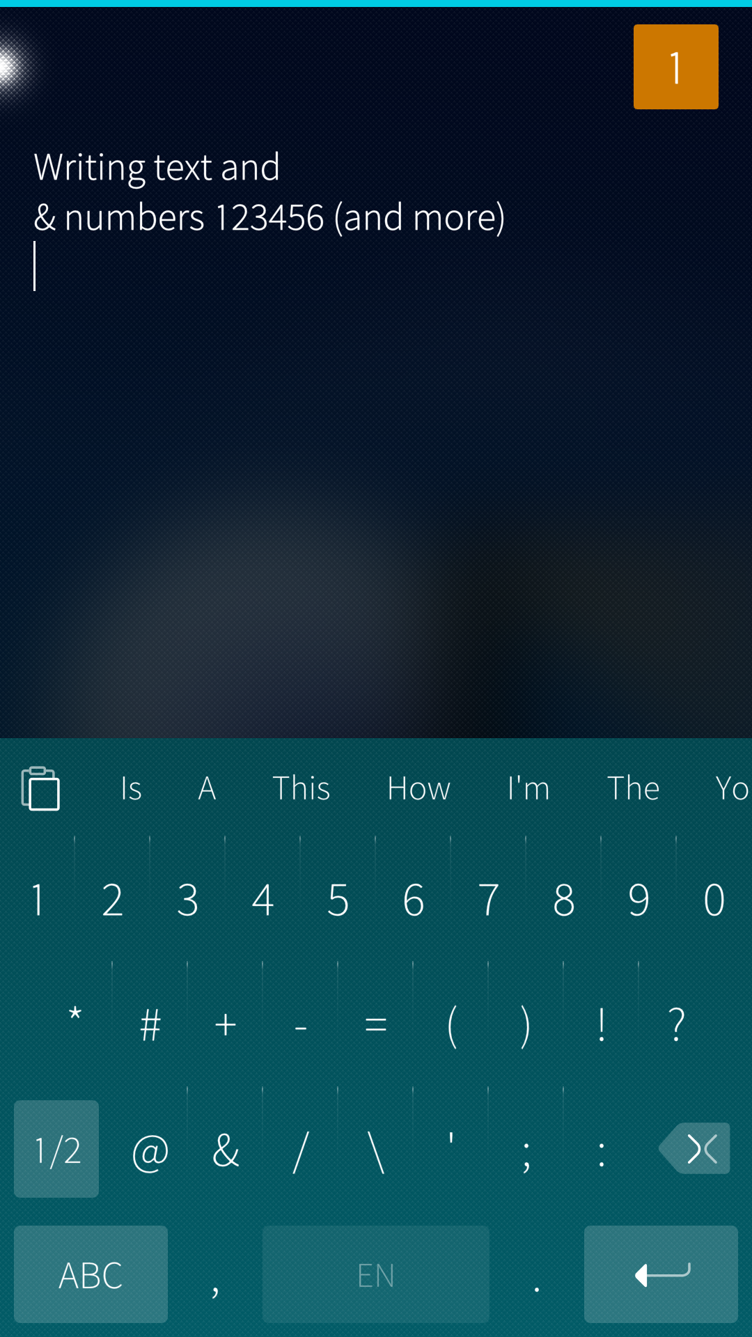 - Pressing “?123” will take you to the numbers & symbols view. Note that pressing “1/2” will take you to the second page of characters. Go back to letters by pressing “Abc”.