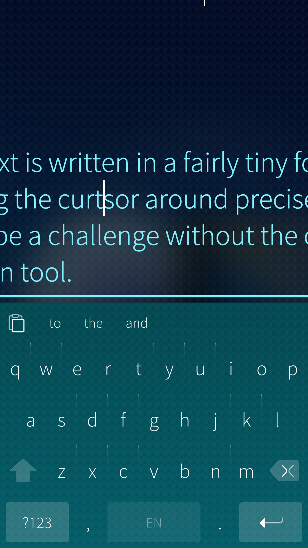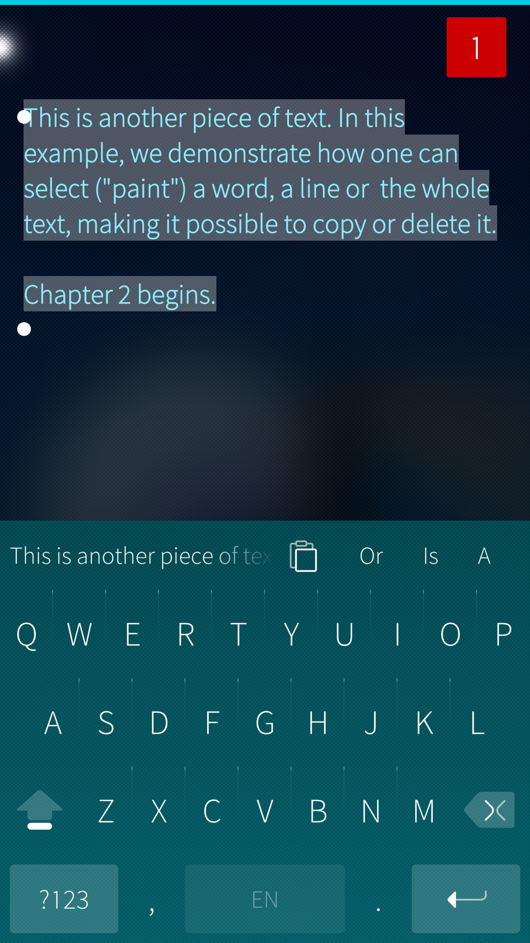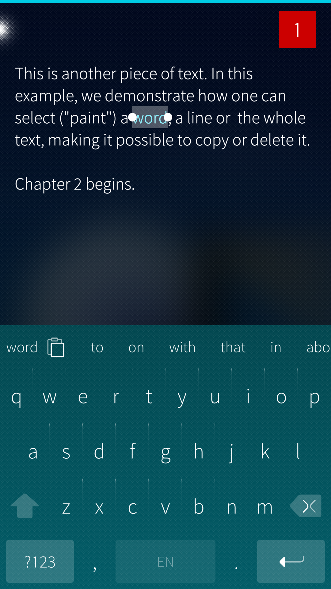 Selecting a piece of text for copying or deletion is easy. Simply, put your fingertip on a word to select. Keep it there for a second and the vibrator plays once as a confirmation of the selection becoming active.
