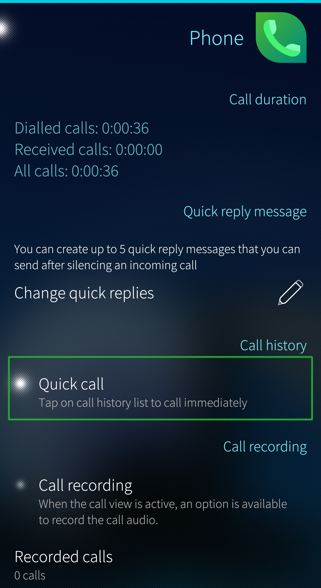 Visit the menu “Settings > Apps > Phone”. Look for the setting “Quick call”.
