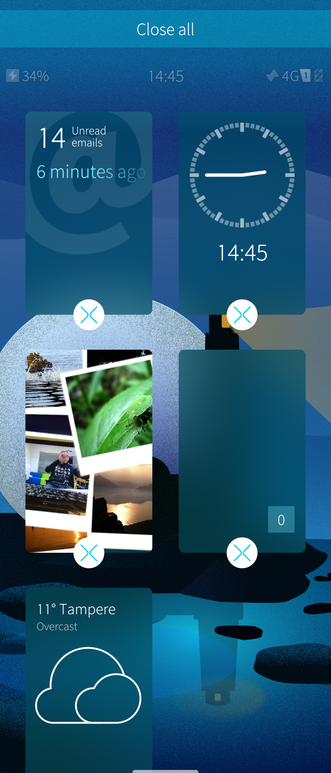 It is easy to close apps in the Home view. Long-tap any point of the display for a couple of seconds. The thumbnails will get small white circles with a cross on them (see below). Close one or more apps by tapping those circles. If you want to close all of your apps, pull down the command “Close all” and lift up the fingertip from the display (if nothing happens, tap “Close all”).