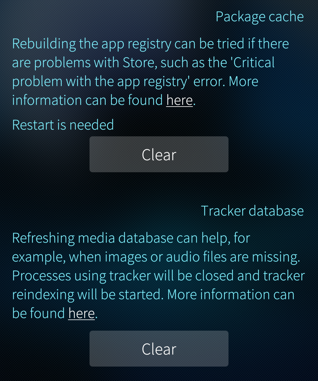 This tool is to clear the Tracker database holding the media file index. Use it if not all of your music or pictures appear in the relevant apps.