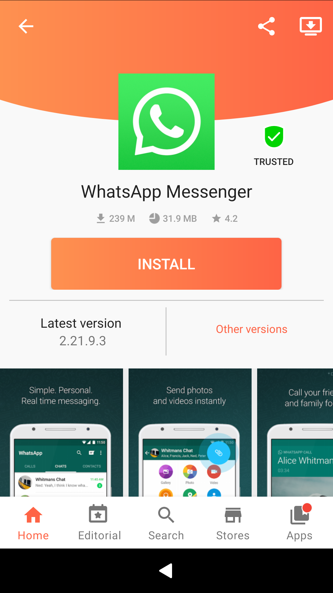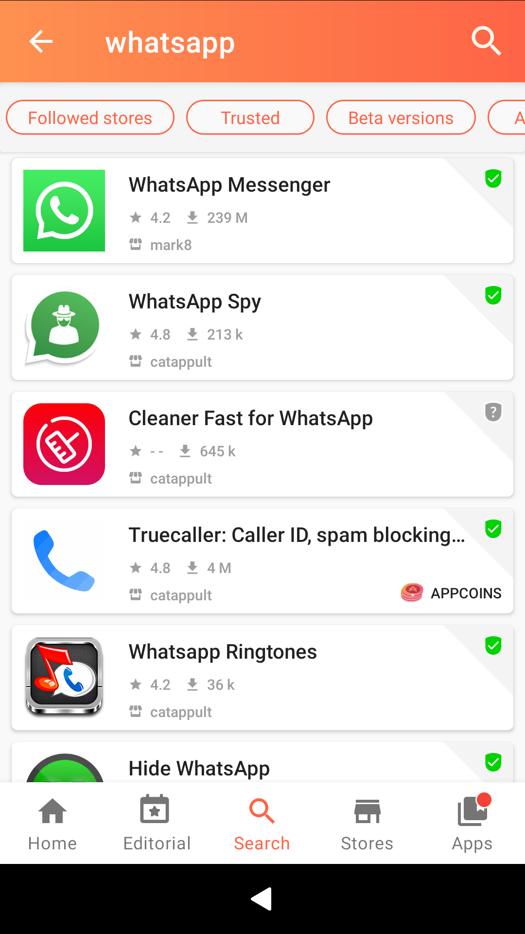 2) Open the Aptoide app. Tap the Search button at the footer of the Home view. Type “whatsapp”. In the search results, tap “WhatsApp Messenger” and install it.
