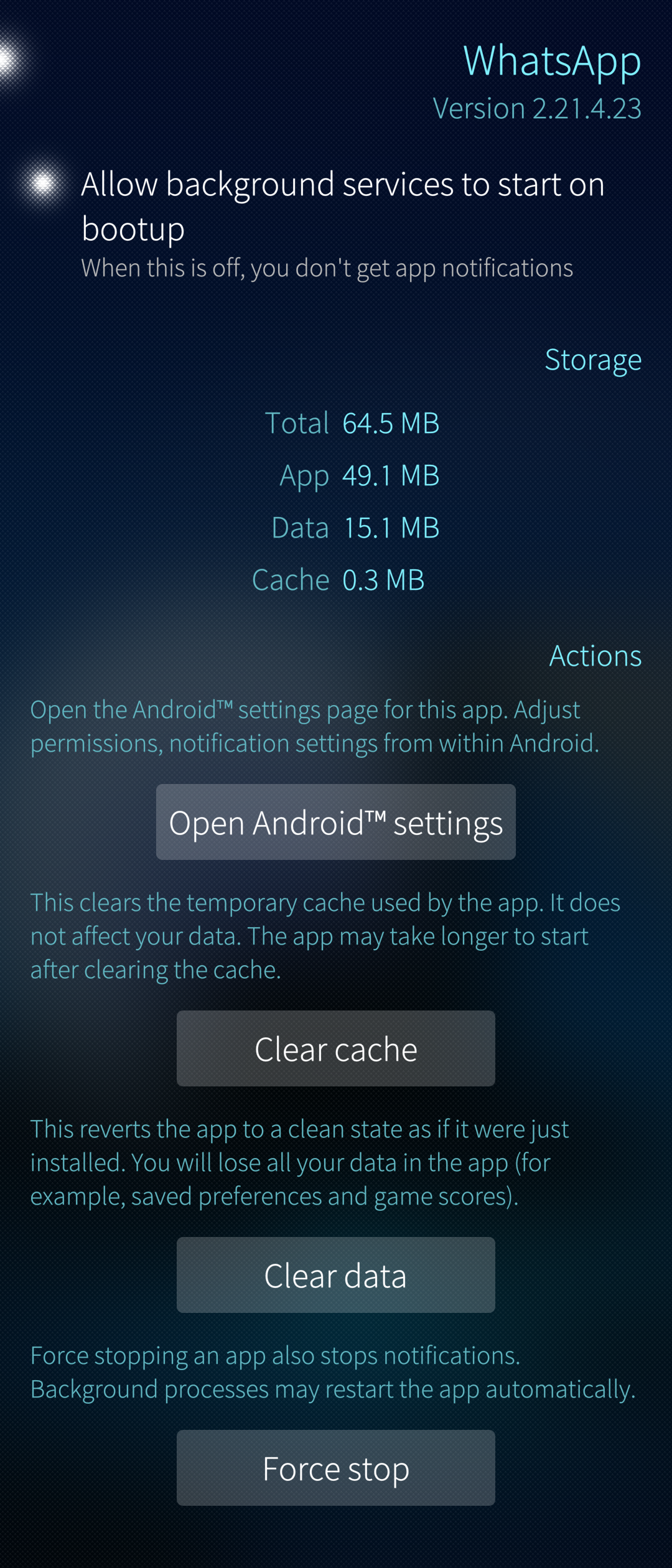 4) Then, enable the option “Allow application background services to start on bootup”. This makes Whatsapp’s background processes start as soon as the device starts up: