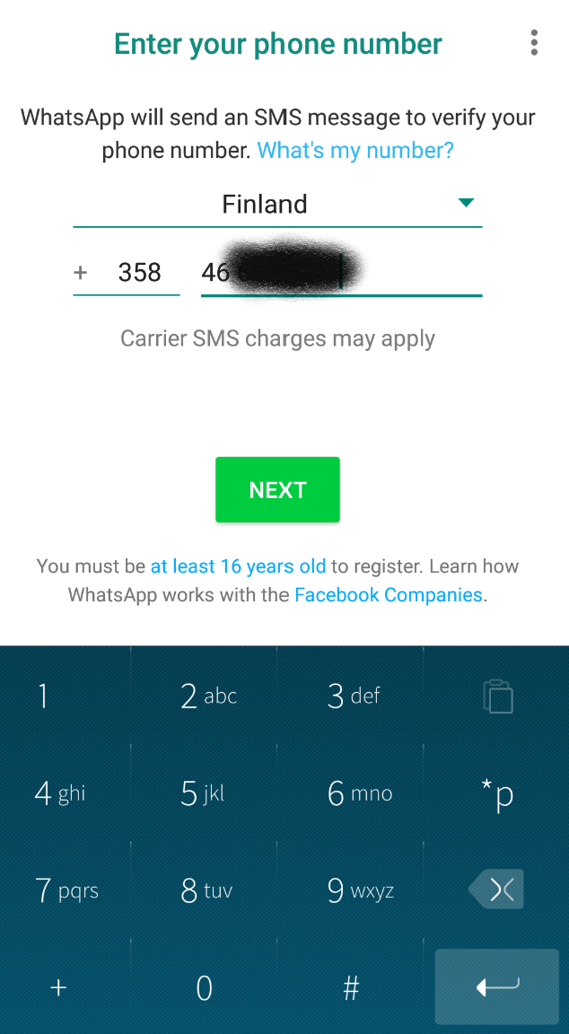 Open WhatsApp. Agree to the Terms and Conditions and fill in your country and phone number (without the leading zero), and press OK.